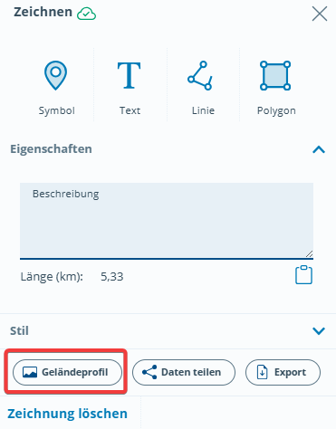 Sie können an verschiedenen Stellen im BayernAtlas durch einen Klick auf den Button Geländeprofil sich das Geländeprofil – einen senkrechten Schnitt durch das Gelände – entlang einer Linie oder Strecke anzeigen lassen: beim Messen, beim Zeichnen, beim Routing.